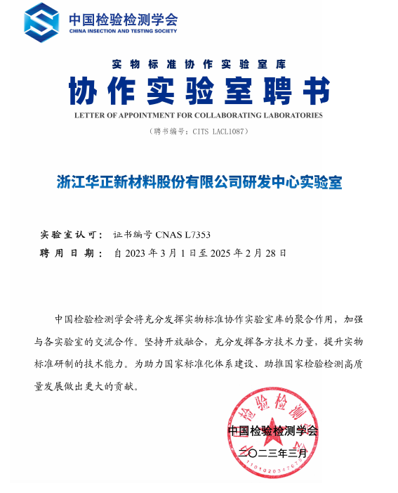 2023年3月,浙江華正新材料股份有限公司研發中心實驗室受聘入庫,成為中國檢驗檢測學會協作實驗室。